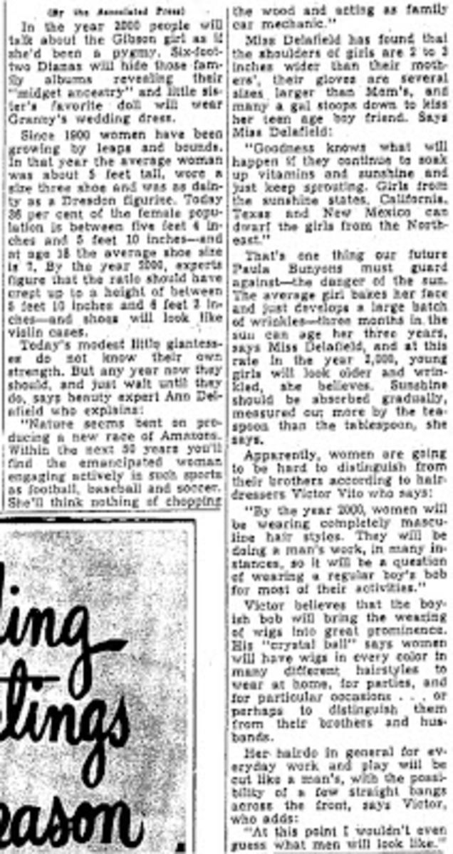 The December 24, 1949 Daily Capital News (Jefferson City, MO) ran an Associated Press article titled, "Authorities Predict Gals Will 'Rise' to New Heights by 2000." An excerpt along with the piece in its entirety appear below.